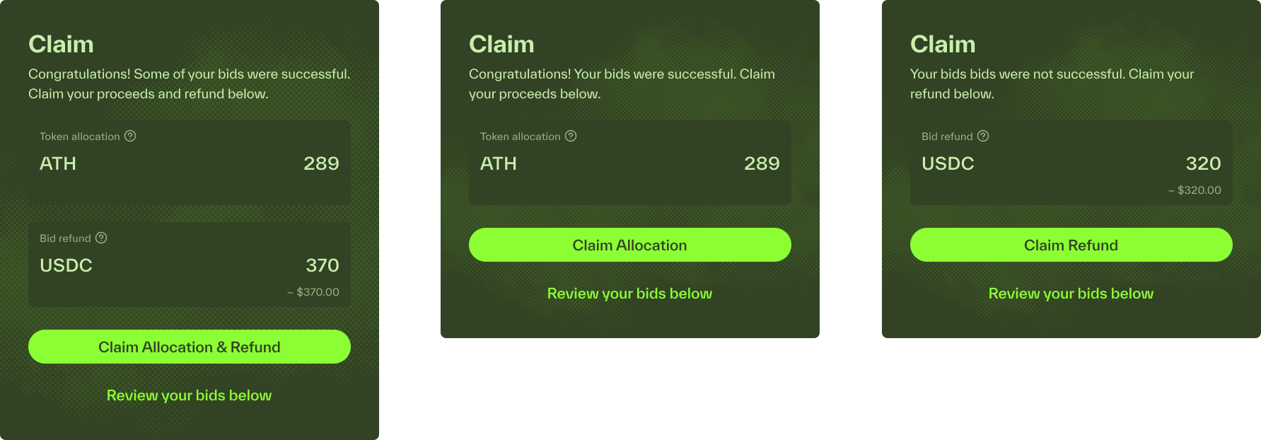 Success: Successful bids lead to token allocation.