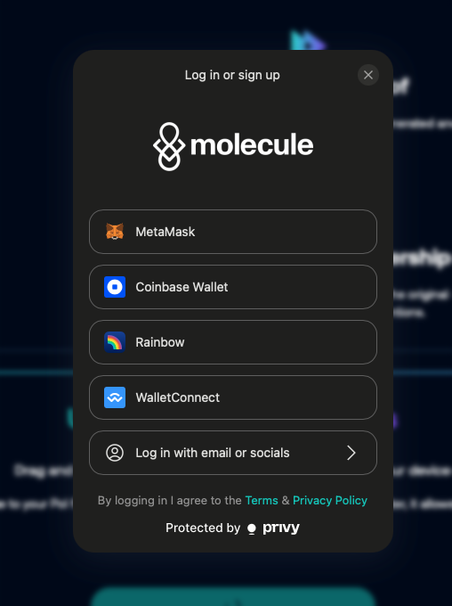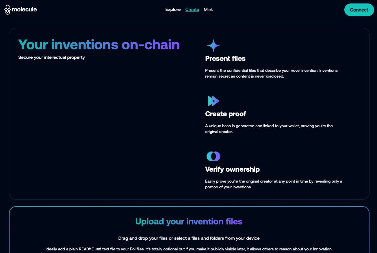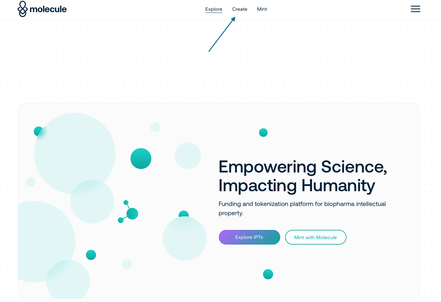 Start by heading over to Molecule’s website. Once you're there, look for the 'Create' button on the homepage. Click on it to begin the process of registering your invention and creating your PoI.