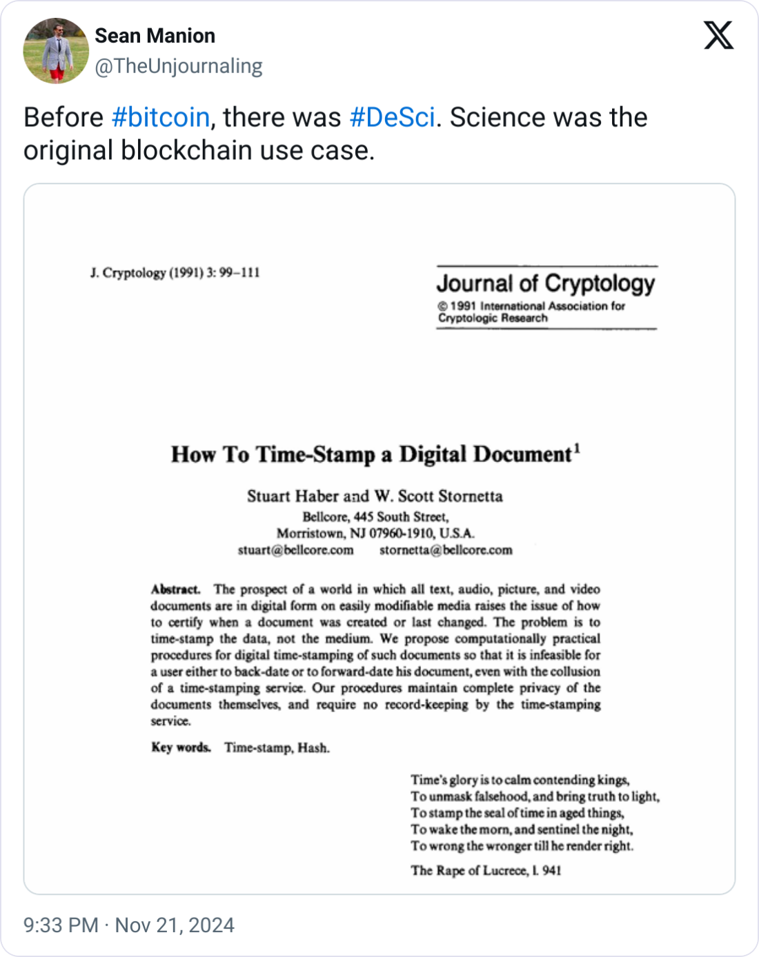 Just show how you did that that would be a huge breakthrough just focus on something very specific then we've got you know that proof of technological fire where we can show here's the paper here's another one it's like arpanet you know sending like the first packet right that first on-chain citation as a function call where you have composable science will be a milestone.