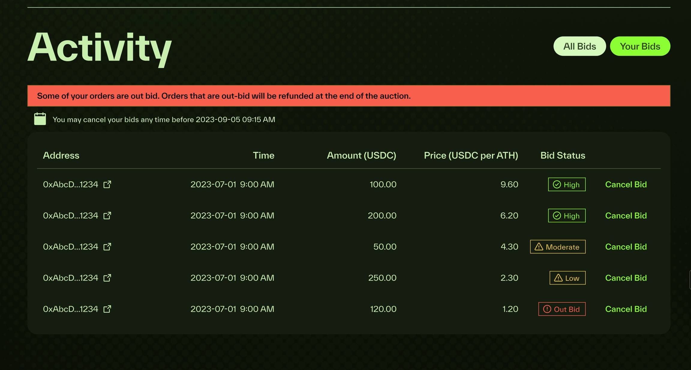 Cancel Bids: If your bid gets outbid, you will receive alerts indicating the need for action in the Activity section. You can cancel your previous bid and resubmit with a higher token price for a better chance. If you don’t cancel bids that end up below the final clearing price of the auction, those bids will be refunded once the auction ends.