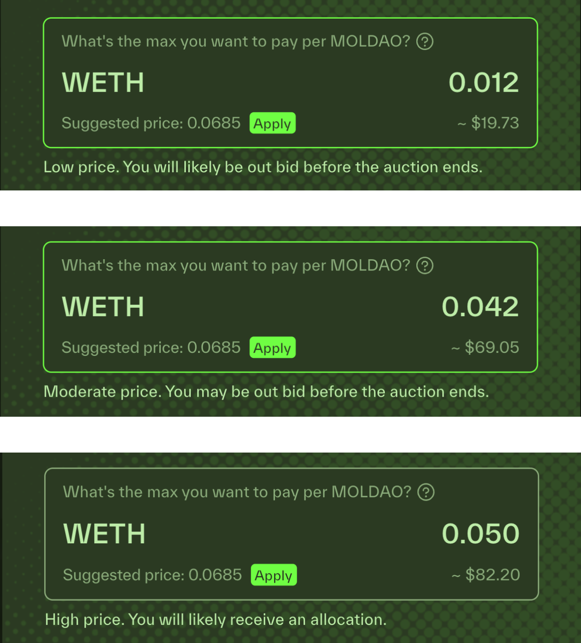 When you enter a price, a price notification will indicate the likelihood of your bid succeeding. Notifications are calculated based on the projected price.