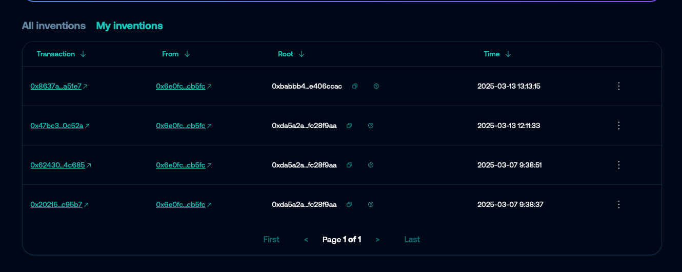 Once your PoI is registered, click on "My Inventions" to access the PoI root and view your registered invention. This is where you can track and manage your PoIs, ensuring your IP is securely stored and easily accessible.