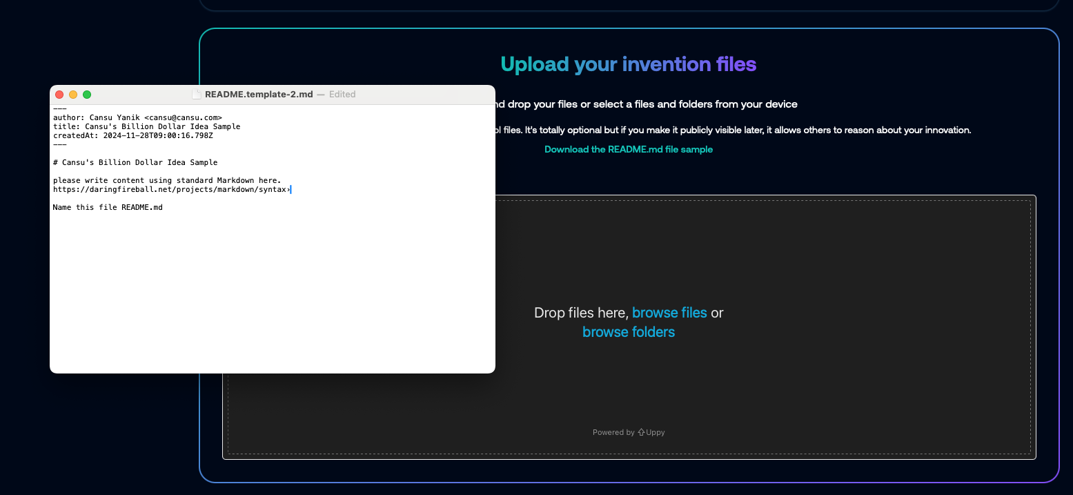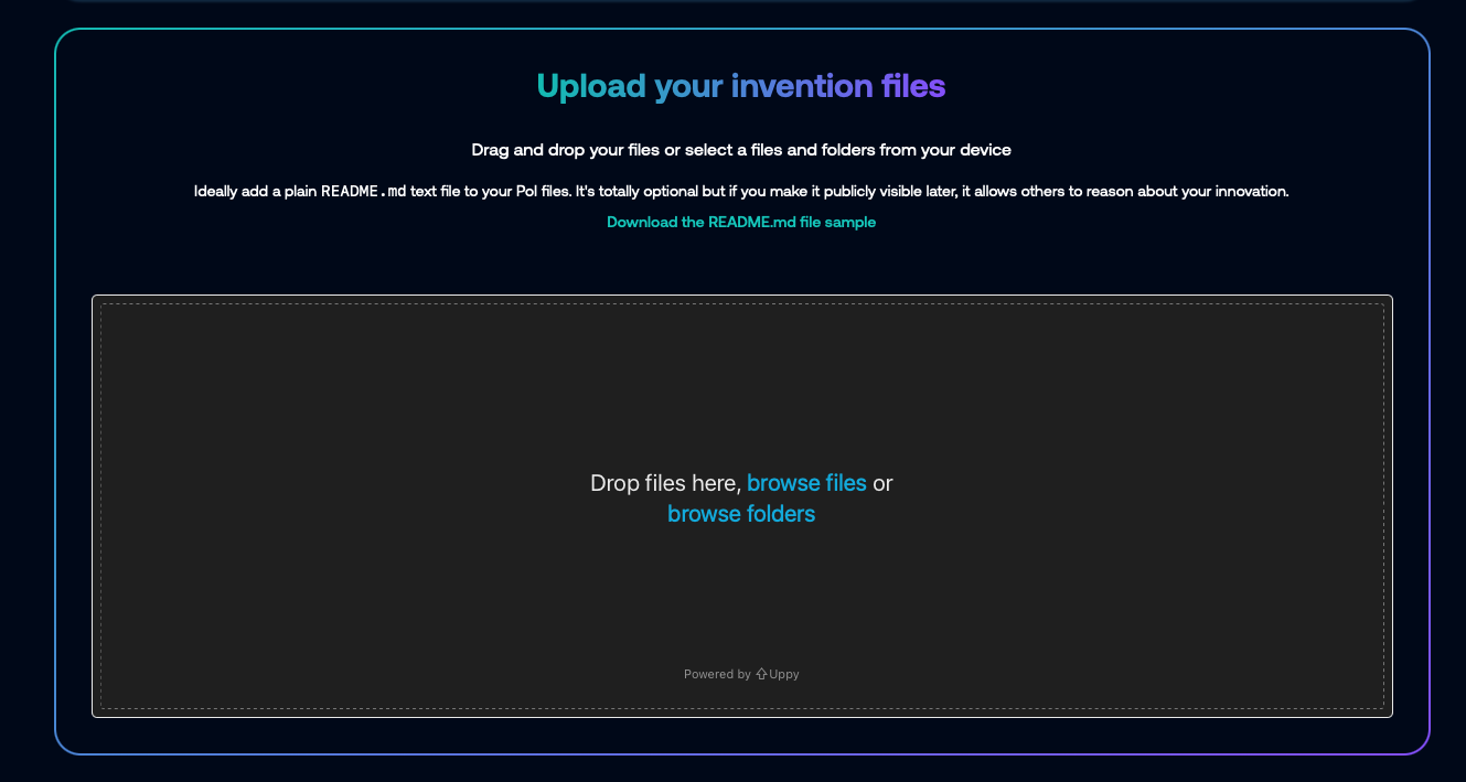 Ideally, add a plain README.md text file to your PoI files. This file is optional, but if you choose to make it publicly visible later, it allows others to understand and reasoning behind your innovation.