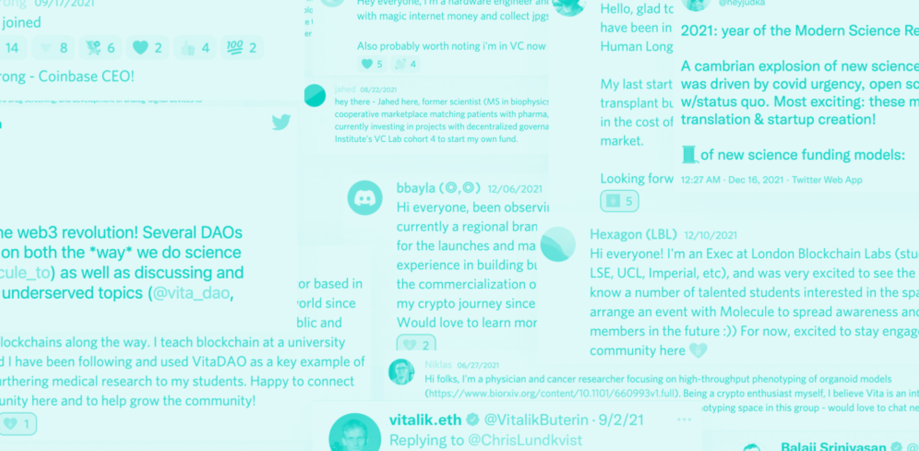 VitaDAO is the first design of what a biotech DAO might look like. One of the core goals at Molecule is to create productized biotech DAO frameworks that enable anyone to build their own biotech DAO, operationalize it, and begin leveraging the effects of a large, open community to achieve their goals. To this end, Molecule is seeking to work with motivated researchers, patient groups, entrepreneurs, community builders and visionaries that are interested in building at the intersection of biotech x web3.