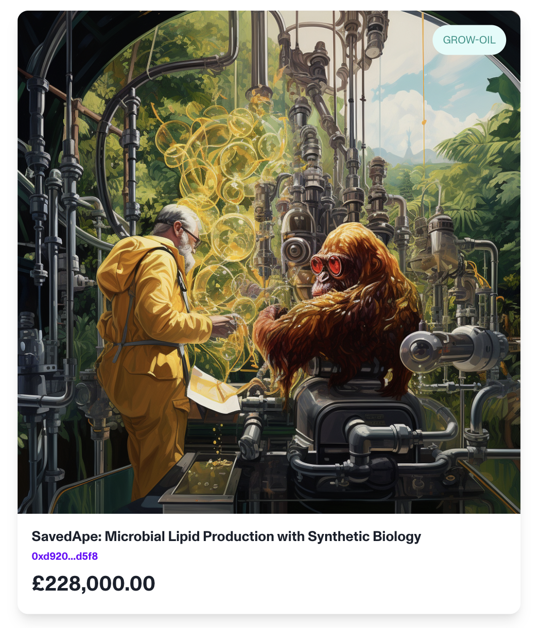 The IP-NFT is named SavedApe: Microbial Lipid Production with Synthetic Biology and the image represents a playful allegory of humans and orangutans - affected by deforestation due to palm oil production - collaborating to develop sustainable solutions in a lab environment, signifying the commitment to replace harmful practices with sustainable bioengineered alternatives.